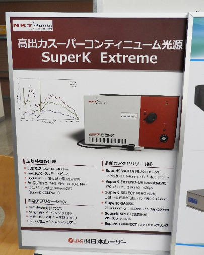 高出力スーパーコンティニューム光源はNKT社独自のフォトニック結晶ファイバー技術を導入したもので、高輝度なシングルモードビーム、400~2400nmの広帯域波長域を持つ。また、350~850nmの波長域では最大2Wを出力する。分光計測などの用途に適したものとなっている。